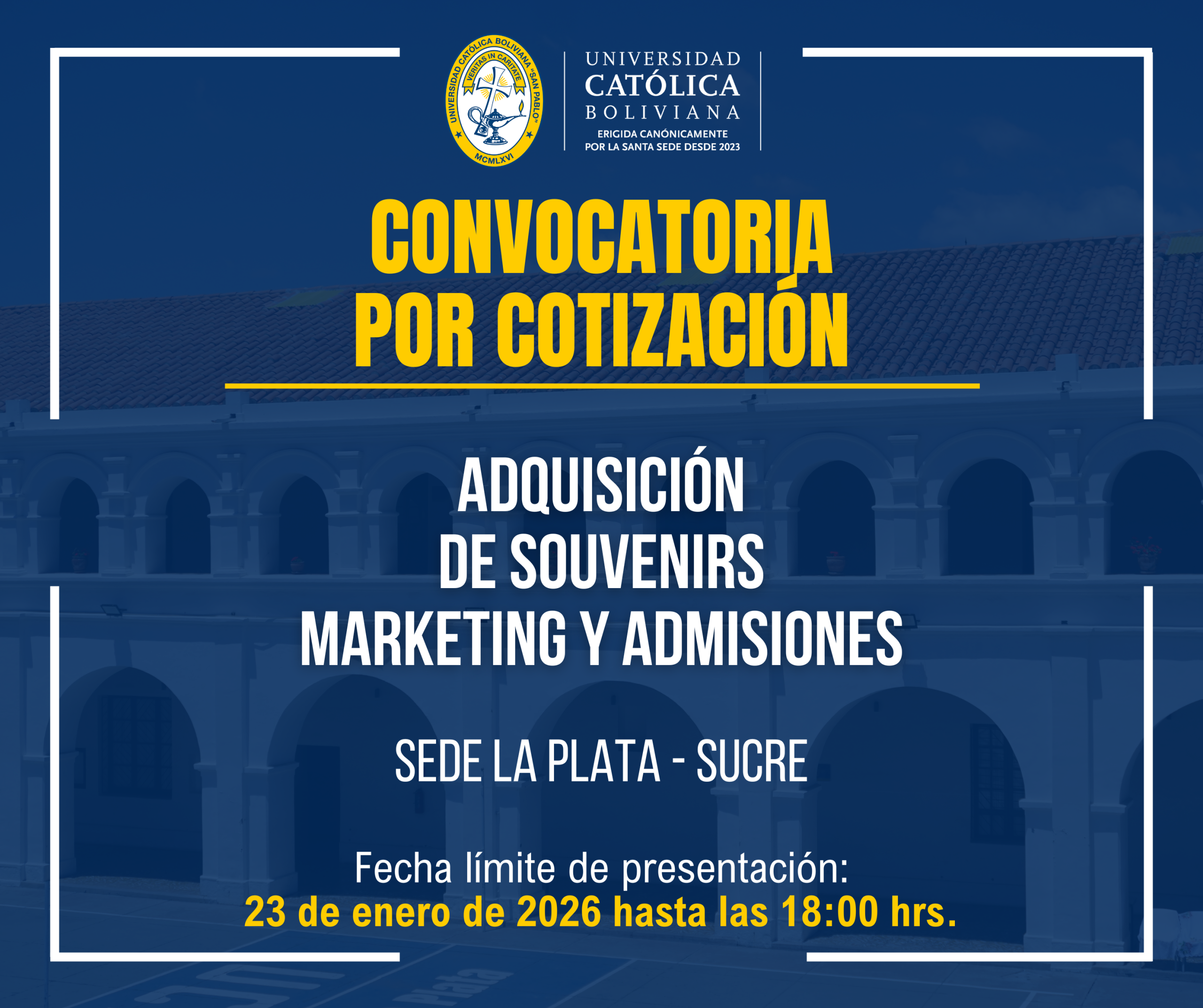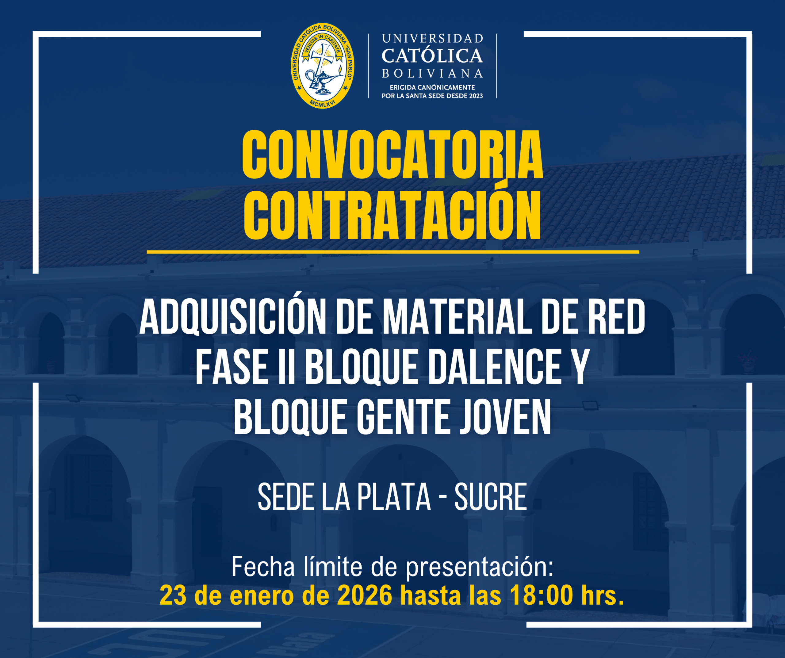 https://ucb.edu.bo/sucre/convocatoria-por-cotizacion-adquisicion-de-material-de-red-fase-ii-bloque-dalence-y-bloque-gente-joven-para-sede-academica-la-plata-ucb-sucre/CONVOCATORIA POR COTIZACIÓN “ADQUISICIÓN DE MATERIAL DE RED FASE II BLOQUE DALENCE Y BLOQUE GENTE JOVEN PARA SEDE ACADÉMICA LA PLATA UCB-SUCRE.