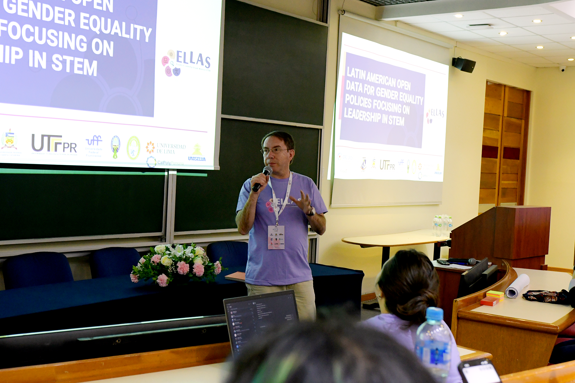 Durante la ceremonia de apertura, el R.P. José Fuentes Cano, Rector de la U.C.B., dio la bienvenida a los asistentes, subrayando la colaboración entre las universidades participantes y la importancia de trabajar conjuntamente para cerrar la brecha de género en STEM en nuestra región. El Rector destacó el compromiso del proyecto con la promoción de políticas efectivas y la difusión de información y datos abiertos para facilitar decisiones informadas que promuevan la equidad de género en las instituciones públicas y privadas. Así también, Cecilia Salazar de la Torre, Directora del CIDES-UMSA enfatizó la participación creciente de mujeres en la universidades bolivianas en los últimos años y su capacitación a nivel de pre y post grado, destacando muchas veces en su desempeño académico. Sin embargo, subrayó la necesidad de que la sociedad fomente el liderazgo de las mujeres en el ámbito profesional y académico.