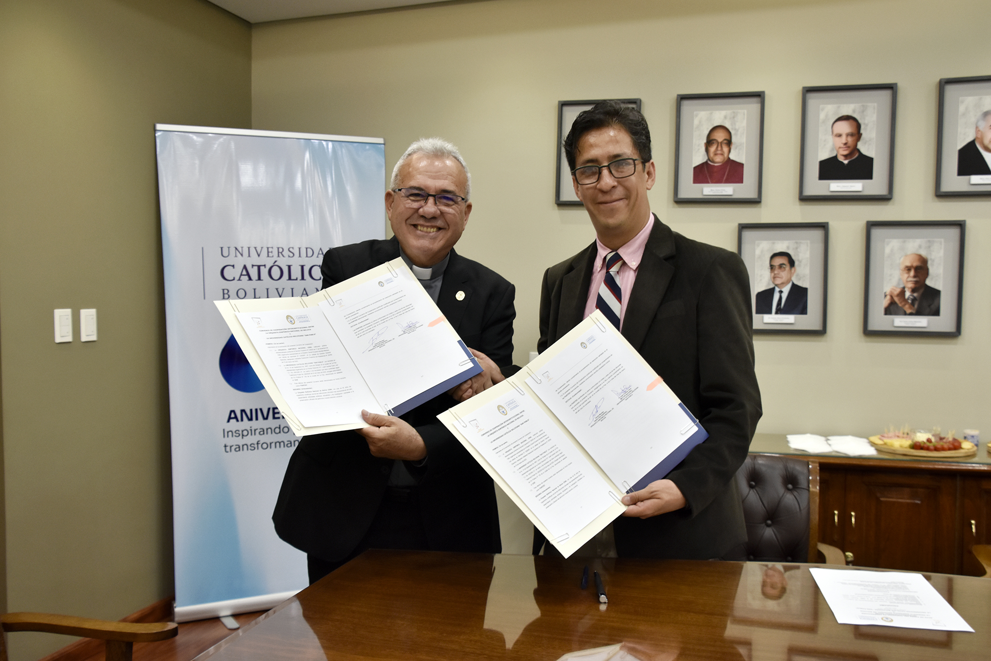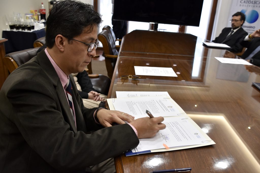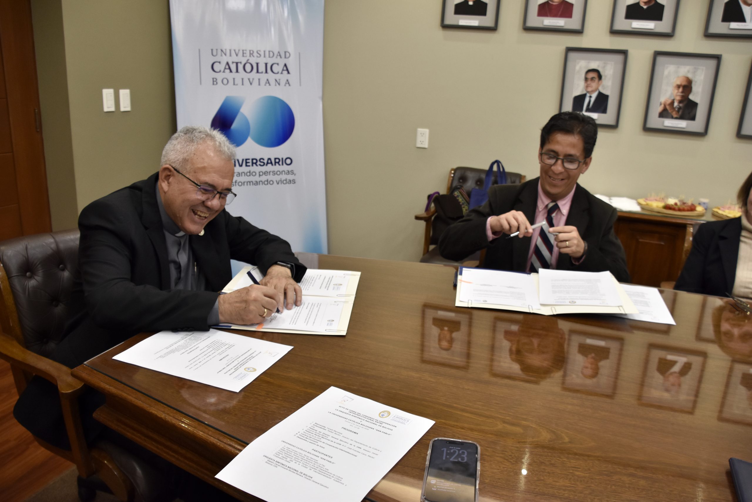 RN 05.03.2026. La Universidad Católica Boliviana “San Pablo” (U.C.B.) y la Orquesta Sinfónica Nacional de Bolivia firmaron un Convenio de Cooperación Interinstitucional con el propósito de fortalecer el vínculo entre la educación universitaria y la práctica artística, promoviendo iniciativas que contribuyan a la formación integral de los estudiantes y al enriquecimiento cultural de la sociedad boliviana. El acuerdo fue suscrito en la ciudad de La Paz por el Rector Nacional de la UCB, José Fuentes Cano, y el Director General Ejecutivo de la Orquesta Sinfónica Nacional, Daniel Eduardo Montes Mariaca.