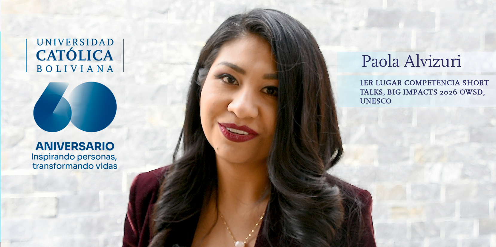 RN 16.03.2026. La Universidad Católica Boliviana “San Pablo” (U.C.B.) celebra un nuevo logro internacional en el marco de su 60 aniversario. La Dra. Paola Alvizuri, docente investigadora de Sede La Paz, obtuvo el primer lugar a nivel mundial en la competencia “Short Talks, Big Impacts”, organizada por la Organization for Women in Science for the Developing World (OWSD), programa que cuenta con el apoyo de la UNESCO y que promueve el liderazgo de mujeres científicas en países en desarrollo.