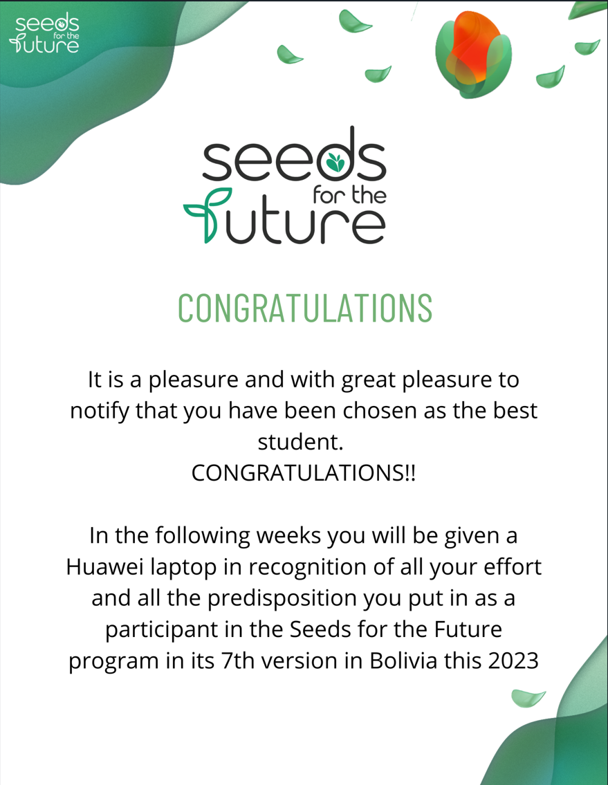 La nota que fue envía a nuestro feliz ganador por parte de Seeds for the Future 2023 destaca lo siguiente: