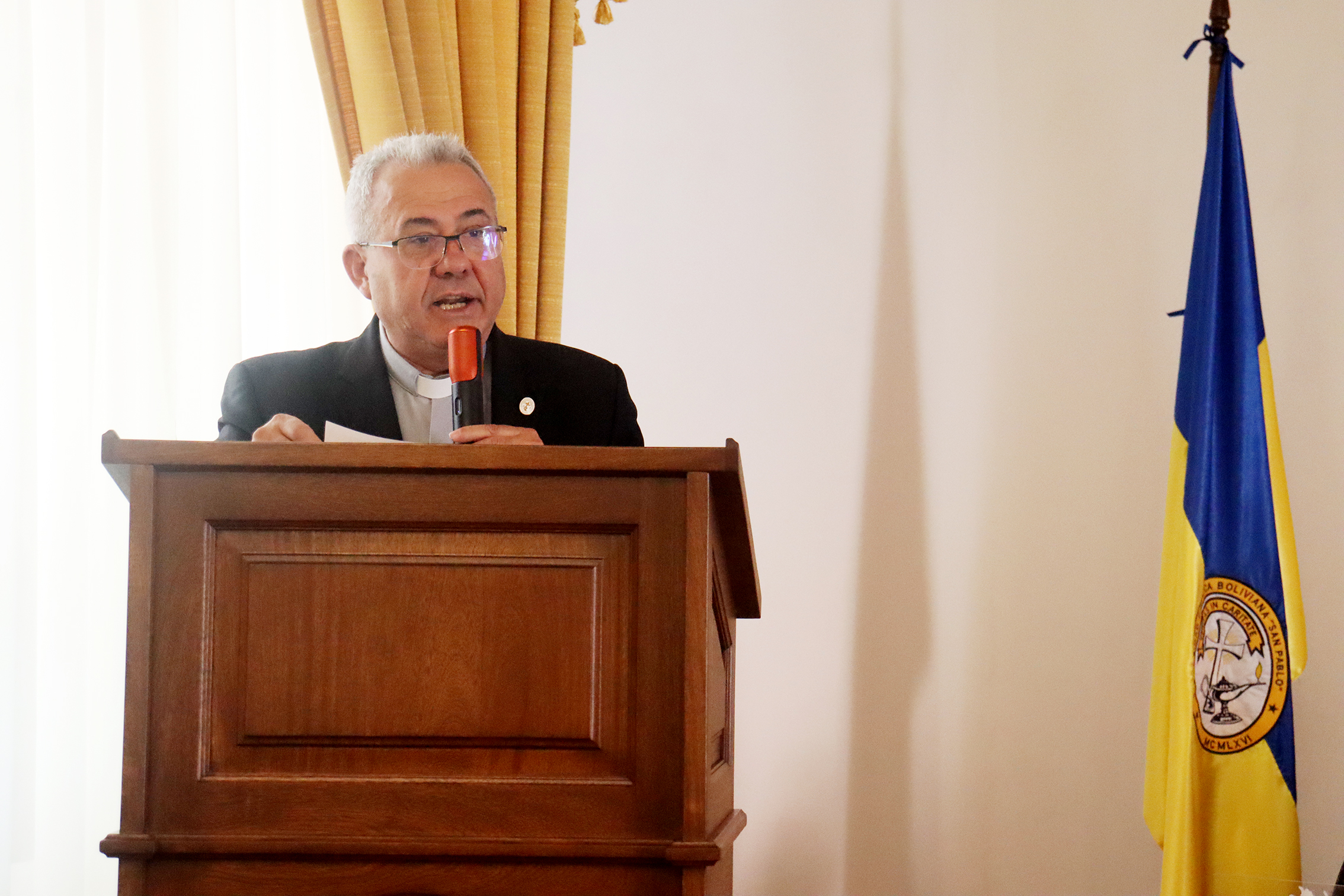 El Rector Nacional de la UCB, P. José Fuentes Cano, por su parte, también celebró el primer aniversario de la Sede La Plata con palabras de gratitud y satisfacción por los logros alcanzados. Agradeció profundamente a la Dra. Grace Paredes y al Dr. Sandy Vargas, destacando su compromiso y liderazgo, que han permitido posicionar a la U.C.B. en Sucre en tan solo un año. Reconoció el trabajo en equipo de las autoridades, docentes y estudiantes, cuyo esfuerzo ha consolidado un nivel académico de excelencia en las carreras existentes. También agradeció el apoyo de las autoridades nacionales y locales, así como el respaldo de la comunidad eclesiástica.